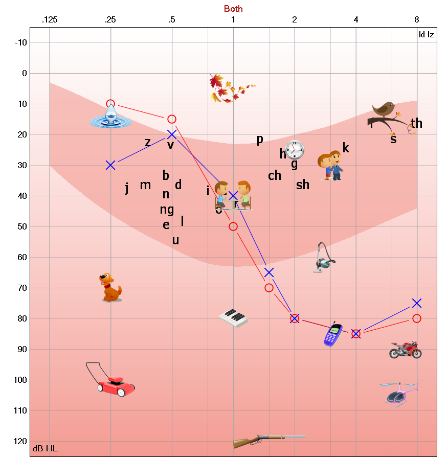 Your hearing will be tested in a sound treated enclosure with background noise levels reduced to those required by the current stringent Australian standards. You will be asked to indicate when you can hear 'beeps' of varying frequency (pitch) and intensity (volume) in each ear. A complete hearing test includes 'air-conduction' testing with headphones and 'bone-conduction' testing using an oscillator (vibrating sound conductor). The results of your hearing test are plotted on your 'audiogram' (see below).